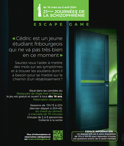 Le comité fribourgeois des Journées de la schizophrénie a créé un jeu d’évasion pour permettre aux Fribourgeois et aux Fribourgeoises de découvrir et de mieux aborder, de façon ludique, les troubles en santé mentale : on peut s’en rétablir et on vous propose quelques pistes ! Annulé en raison de la pandémie de COVID-19 en 2020, cet escape game se veut une expérience à la fois excitante et pédagogique ; les participant-e-s devront parvenir à sortir de deux pièces dans une durée limitée à 45 minutes en résolvant diverses énigmes en lien avec la santé mentale et le processus de rétablissement.