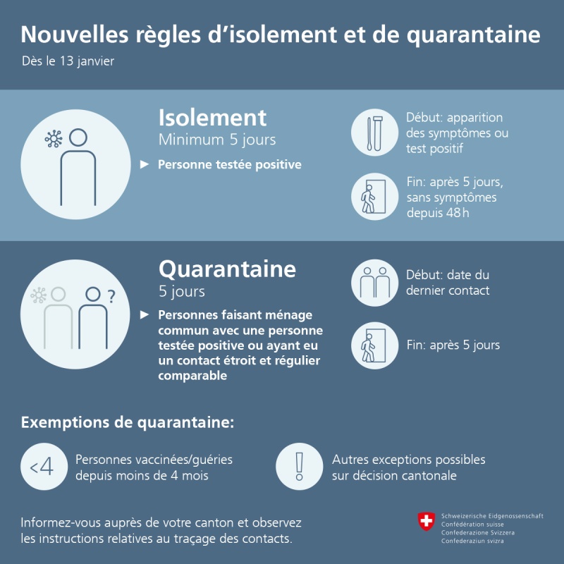 Exemple : J’ai été mis en isolement dimanche 9 janvier. Au lieu des 10 jours d’isolement jusqu’à mardi 18 janvier compris, je peux recommencer à sortir le vendredi 14 janvier. Je dois toutefois être libre de symptômes depuis le 12 janvier compris.