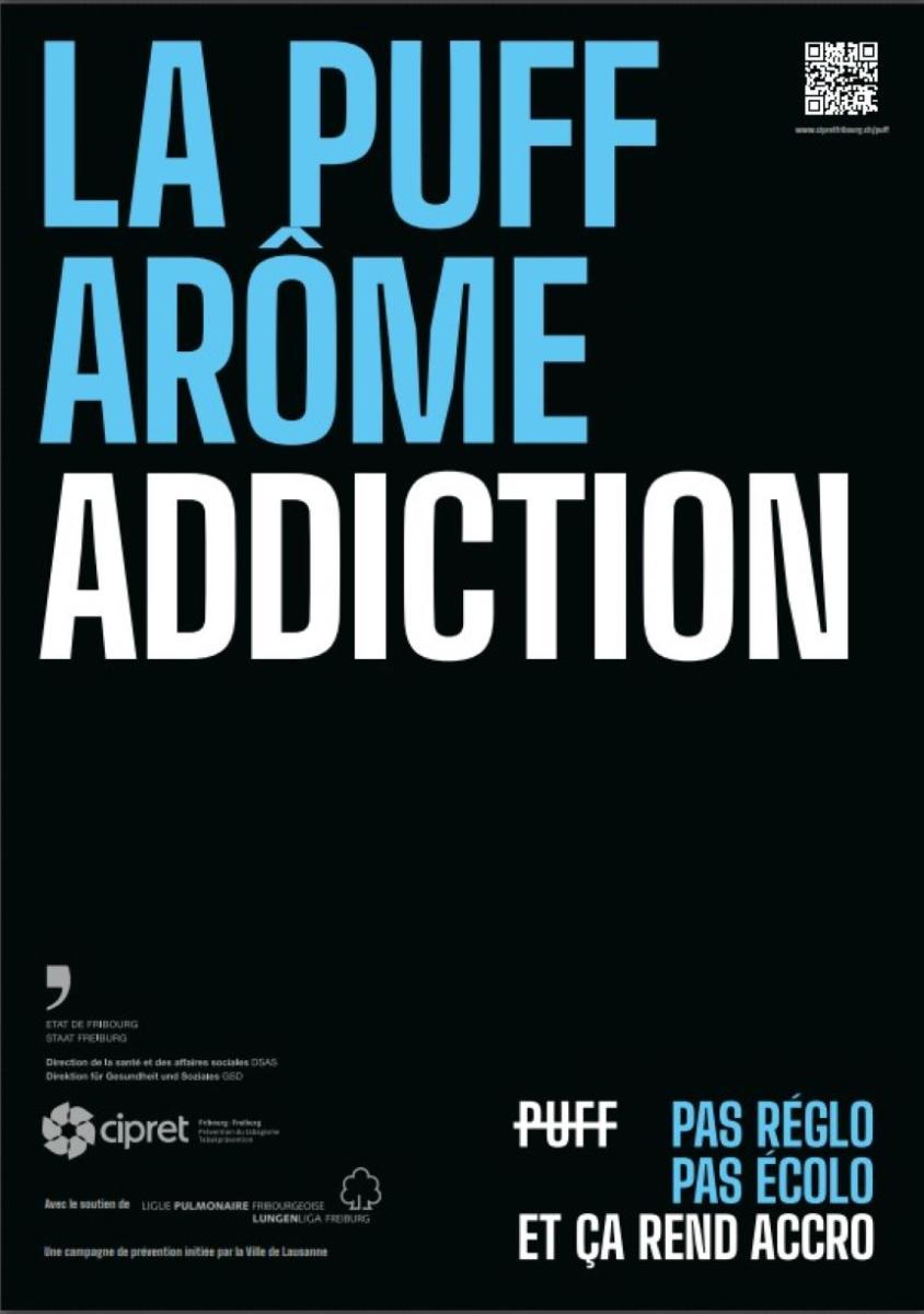 La campagne « Parlons puff », initialement développée par la Ville de Lausanne et adaptée à notre canton, vise à attirer l’attention des adultes sur l’existence et la dangerosité des puffs. Elle a pour objectif de les inviter à ouvrir le dialogue avec les jeunes. Parents, enseignant-e-s et tout adulte engagé dans le domaine des sports ou des loisirs sont invités à échanger sur les puffs avec les enfants et adolescent-e-s qu’ils côtoient afin de les informer et les aider à faire des choix pour leur santé. Elle sera diffusée sur les réseaux sociaux, dans les transports en commun fribourgeois et mise à disposition des professionnel-le-s.
