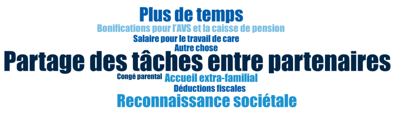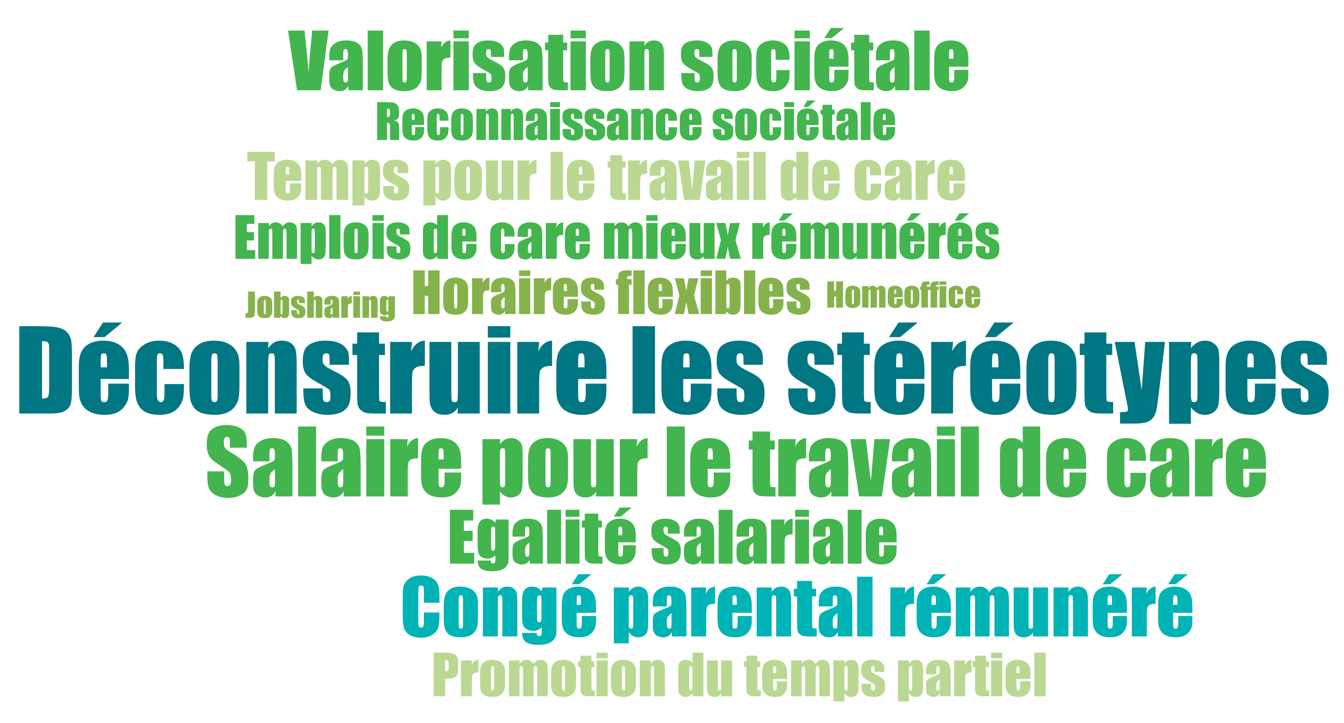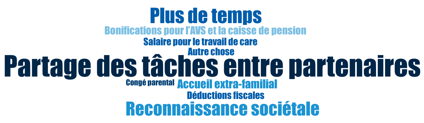 - 40 % des participant-e-s ont fait part, pour leur propre situation, de leurs attentes en matière de travail de care qui consistent en un «partage des tâches entre partenaires», «plus de temps» et une «valorisation sociétale».