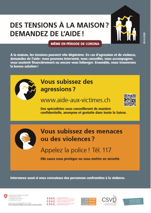 Berne, 28.04.2020 - Les restrictions de la liberté de mouvement pour lutter contre la pandémie de coronavirus peuvent entraîner une augmentation des agressions et empêcher les victimes de violence domestique de se faire aider. Pour que toutes les personnes concernées sachent où trouver de l’aide, la task force contre la violence domestique de la Confédération et des cantons lance une action d’affichage. Les associations professionnelles des pharmacies, des drogueries, des boulangeries et des confiseries sont les premières à soutenir cette initiative.