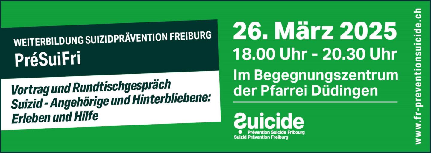 L'association PréSuiFri organise le mercredi 26 mars de 18h00 à 20h30 au Begegnungszentrum de la paroisse de Guin sa prochaine conférence et table ronde en allemand sur le thème "Suizid – Angehörige und Hinterbliebene : Erleben und Hilfe".