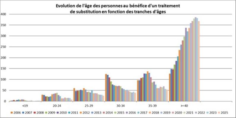 Concernant leur accompagnement, 235 (2024 : 250) patients et patientes étaient suivi-e-s par le Centre cantonal d'addictologie (CCA) , 11 (2024 : 14) par le centre de psychiatrie forensique tandis que 54 (2024 : 60) médecins traitants privés prenaient en charge 248 (2024 : 249) personnes.74 patients et patientes reçoivent leur médication en cabinet du médecin traitant, 16 en institution, 376 en pharmacie, 15 en prison et pour 13, il n'y a pas d'information disponible.368 (2024 : 377) de ces personnes sont âgées de plus de 40 ans, ce qui témoigne du vieillissement important de cette population. Voir tableau ci-après : "Evolution de l'âge des personnes au bénéfice d'un traitement de substitution en fonction des tranches d'âge". La baisse de 6% du nombre de TAO peut également s’expliquer par 6 décès et par le fait que l’inhalation de cocaïne, pour laquelle il n’y a pas de produit substitution, est de plus en plus répandue auprès des consommateurs et consommatrices.Il est à noter également qu'un tiers des personnes bénéficiant d'un traitement de substitution a indiqué que son revenu provenait d'un travail rémunéré à plein temps (151 personnes). 158 personnes sont au bénéfice d'une rente Al, 108 de l'aide sociale et 12 sont au chômage. Pour 65 personnes, les données sont manquantes.Par ailleurs, 71 personnes ont été testées positives à l'hépatite C et 264 négatives. Pour 159 personnes, les données sont manquantes.En collaboration avec le CCA et la pharmacienne cantonale, le Service a organisé la douzième formation continue annuelle sur les traitements agonistes opioïdes TAO destinée aux médecins, psychiatres et aux pharmaciens et pharmaciennes du canton.