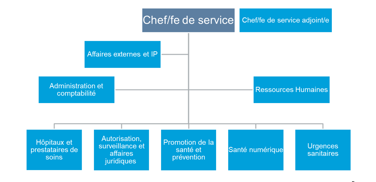 Le Service de la santé publique dépend de la Direction de la santé et des affaires sociales (DSAS). Une trentaine de collaboratrices et collaborateurs gèrent plusieurs domaines d'activités (planification, subventionnement et financement, contrôle et surveillance, police sanitaire).