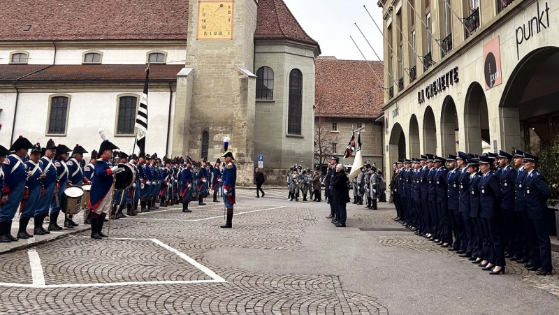 Après le tir de trois coups de canon par la Batterie 13 Fribourg, depuis la Lorette, l’Ecole de police 2023 s’est déplacée depuis la Place Georges Python, en cortège, jusqu’à la cathédrale St-Nicolas, accompagnée du Directeur de la sécurité, de la justice et du sport, de l’état-major, des officiers et officière, de la garde d’honneur et de la fanfare de la Police cantonale.