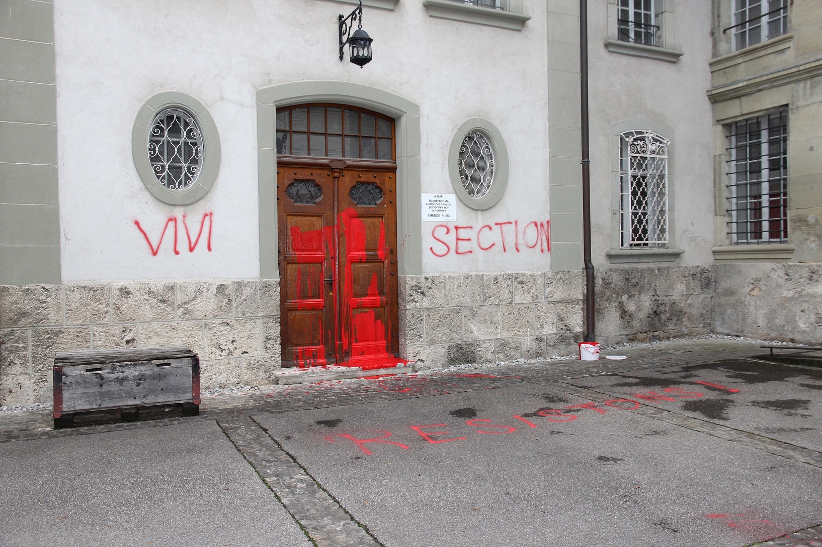 Un peu plus tard dans la matinée, des dommages similaires ont été constatés à Fribourg, sur le bâtiment occupé par le Secrétariat du Grand Conseil et le Bureau de l’égalité hommes-femmes et de la famille. Enfin, des inconnus ont utilisé de la peinture rouge et noir pour maculer un bâtiment de l’Université de Fribourg, sis au Boulevard de Pérolles.