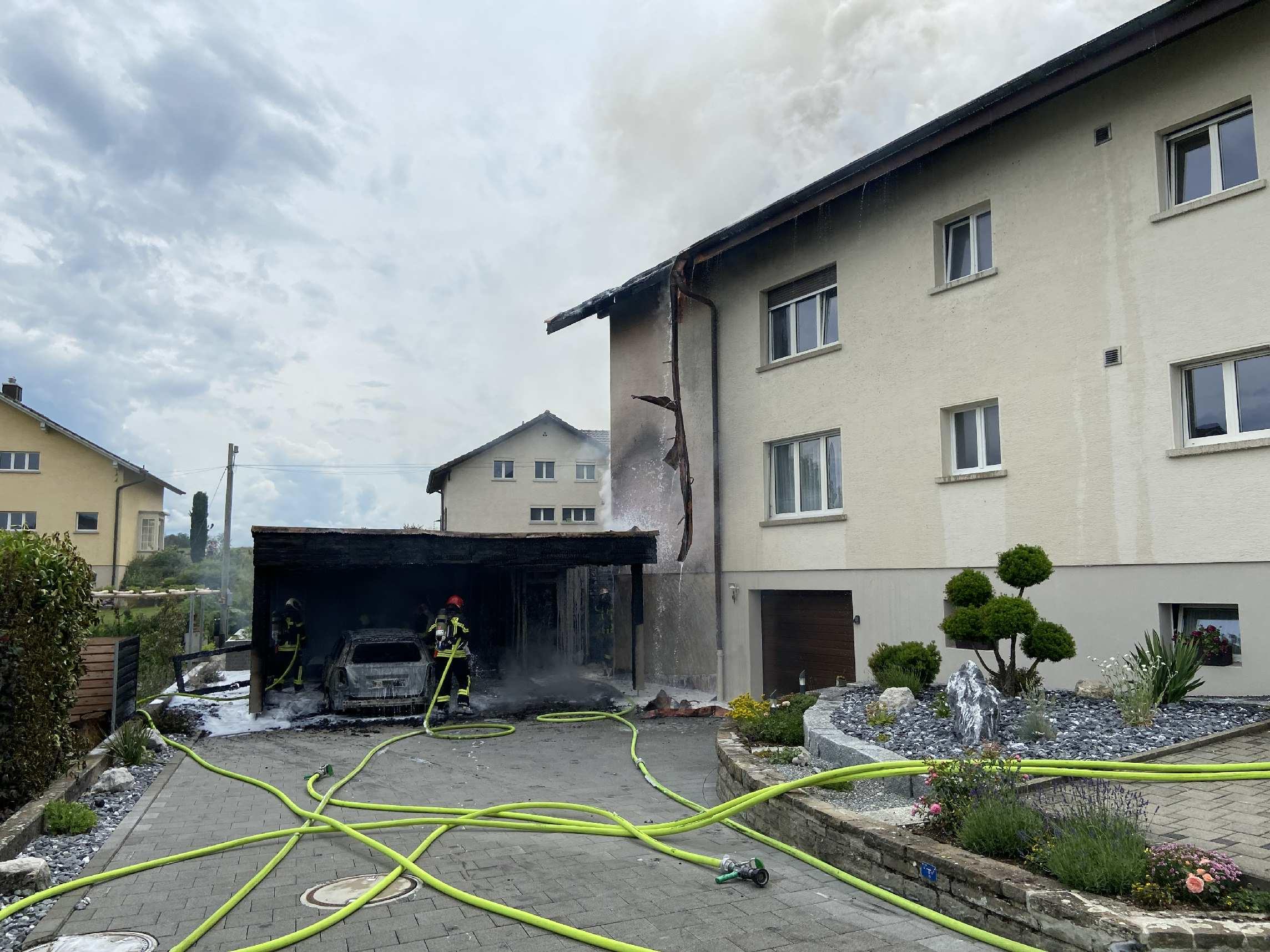 Mercredi 23 juin 2021, vers 15h14, les sapeurs-pompiers du centre de renfort de Düdingen, les sapeurs-pompiers Untere Sense et la police cantonale ont été alertés qu'une voiture était en feu à Wünnewil. Cette dernière était stationnée dans un abri pour voitures. Les flammes se sont propagées de la voiture à l'abri pour véhicules, puis à la façade et au toit d'un immeuble d'habitation directement adjacent à l'abri pour voitures. Les pompiers ont pu rapidement maîtriser l'incendie. Ils ont pu empêcher que le feu se propage à une annexe habitée située derrière l'immeuble d'habitation.