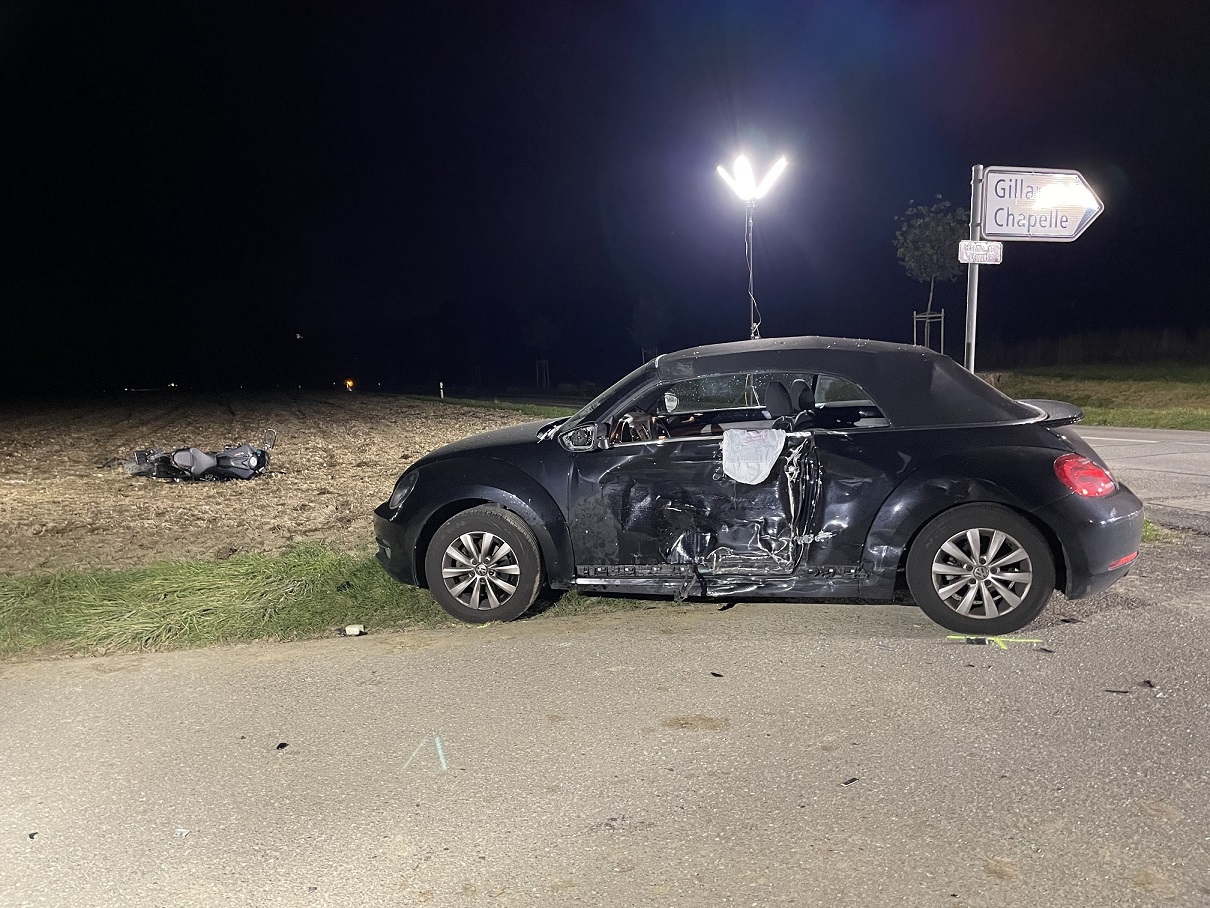 Le jeudi 19 septembre 2024, vers 1830h, un motocycliste de 19 ans circulant d’Oron en direction de Promasens a remonté une file de véhicules ralentis pour les besoins du trafic. Il est entré en collision avec une voiture conduite par une femme de 58 ans qui obliquait à gauche pour emprunter le chemin de Coppet. Grièvement blessé, il a été pris en charge par un équipage de la REGA et emmené dans un hôpital. La conductrice de la voiture, également blessée, a été consultée sur place par les ambulanciers.