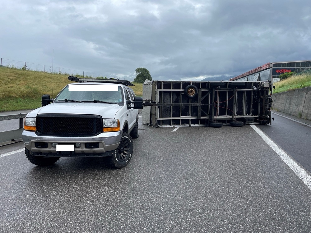 Sur place, il a été constaté que la remorque, transportant des supports métalliques et accrochée à un 4x4, s’était renversée sur son flanc en travers des voies de circulation.