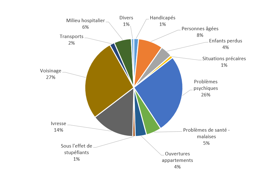 2021 2022 2023 2024 Evolution Total 7'807 8'220 7'973 7'398 -7% dont suicides y.c. tentatives 117 175 169 163 -4 % violences domestiques 512 586 577 664 15 % personnes en difficultés 2'375 2'628 2'112 1'639 -22 % annonces de disparition 812 669 794 762 -4 % -