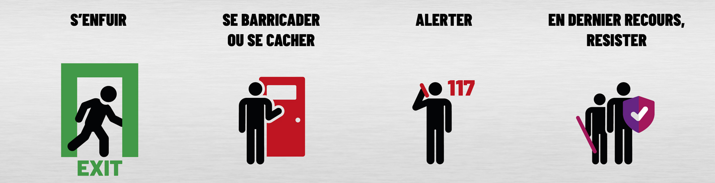 Cette initiative vise à préparer chacun et chacune à faire face à ce genre de menace : s’enfuir, se barricader ou se cacher, alerter et, en dernier recours, résister.