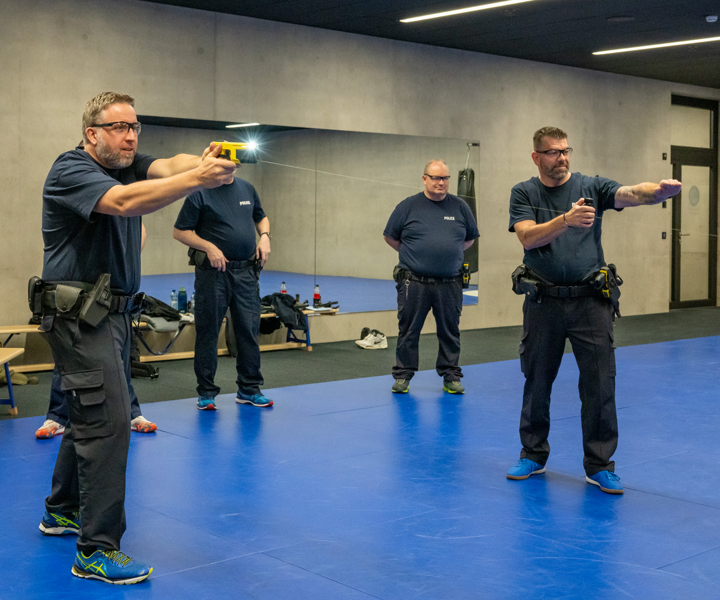 Le pistolet à impulsions électriques, plus communément appelé « Taser », a gagné du terrain au sein de la Police cantonale. Hormis les policiers du Groupe d’intervention, les membres du Groupe sécurité et transferts sont devenus les premiers collaborateurs et collaboratrices de la Police fribourgeoise à en être pourvus. Face à L’évolution des risques et des menaces liés au transport de détenu·e·s ainsi que pour des raisons de légitime défense, ce moyen de contrainte non létal a été jugé nécessaire et plus adapté qu’une arme à feu dans les milieux carcéraux.