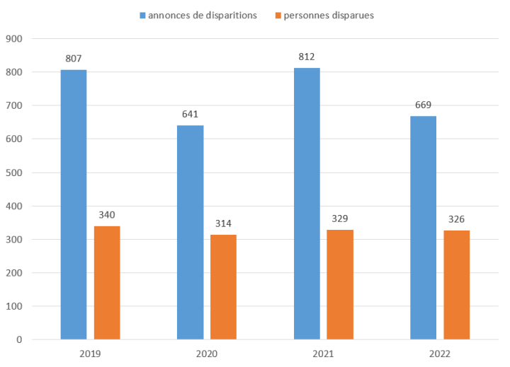 | Annonces de disparitions | 812 | 669 | 794 | 762 | -4 % |
