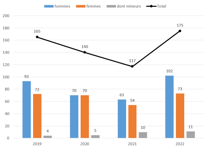 2021 2022 2023 2024 Evolution Total 72 106 71 82 15 % Hommes 31 63 33 39 18 % Femmes 41 43 38 43 13 %