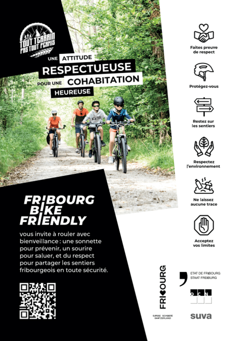 La campagne sera également mise en œuvre lors des événements suivants, où des sonnettes et flyers seront remis, afin de toucher un public plus large:• Bourses aux vélos de PRO VELO Fribourg (29 mars et 20 septembre)• Coupe VTT Fribourgeoise à Ursy (17 mai) et Alterswil (17 août)• Bike Revolution à Gruyères, (13-15 juin) où les clubs de VTT locaux se réuniront autour de lathématique de la sécurité, en partenariat avec la Suva• Bull'Bouge 2025 (18 mai)• Sur les sentiers fribourgeois, où les baliseurs de l’Union fribourgeoise du Tourisme et lesambassadeurs nature du Parc naturel régional Gruyère Pays-d’Enhaut participeront activement à la distribution d’informations et à la sensibilisation des usagers sur le terrain.