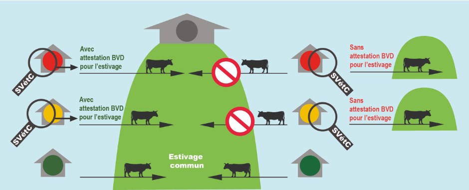 Avant de mettre des animaux en estivage commun, les détenteurs s’assurent auprès du responsable de l’estivage que seuls des animaux provenant d’exploitations signalisées par un feu vert ou d’exploitations en possession d’une « attestation BVD pour l’estivage », délivrée par le SVétC, se trouveront sur le pâturage d’estivage.