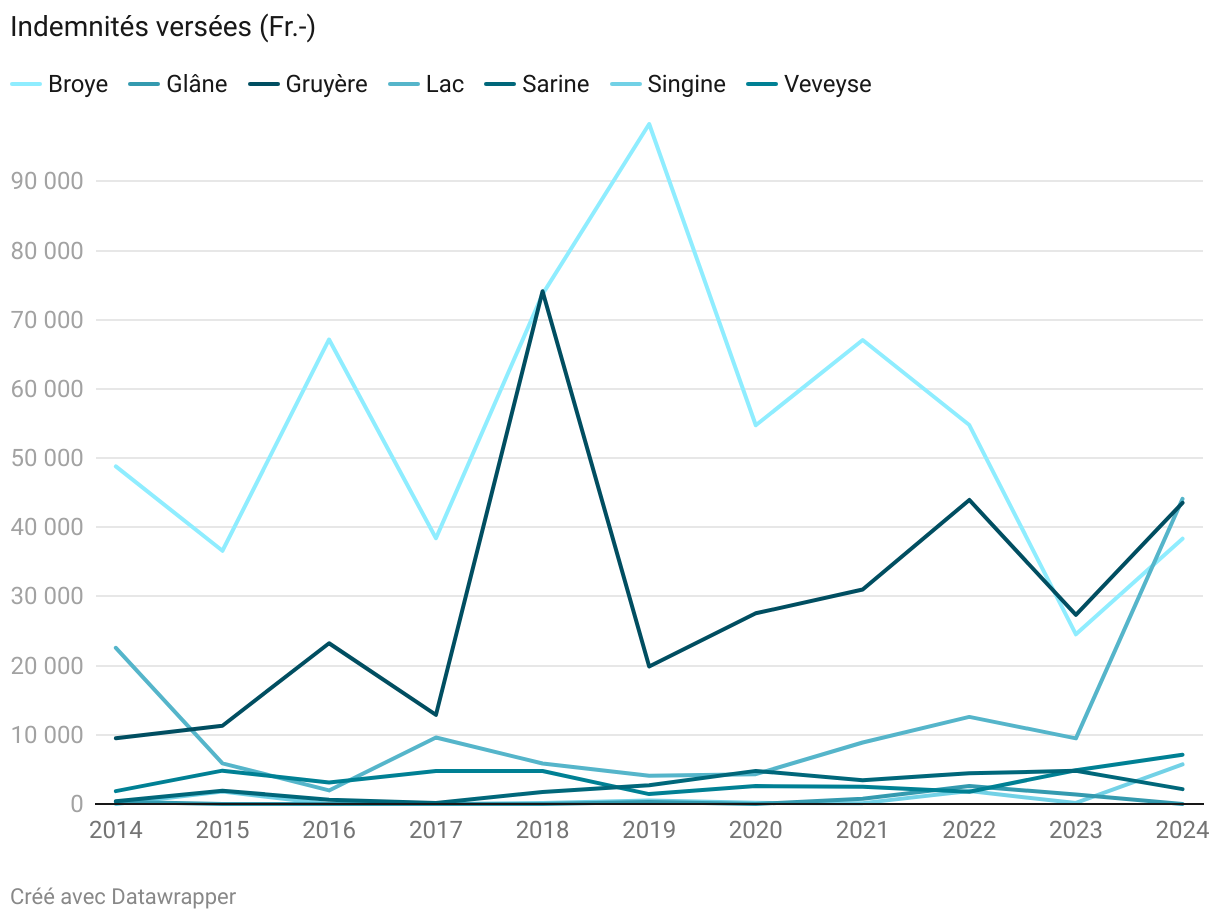 Le canton de Fribourg indemnise chaque année entre 50 000 et 200'000 CHF de dégâts causés par la faune sauvage. En 2023, environ 70'000 CHF ont été versés pour des dégâts causés par les sangliers dans les SAU.
