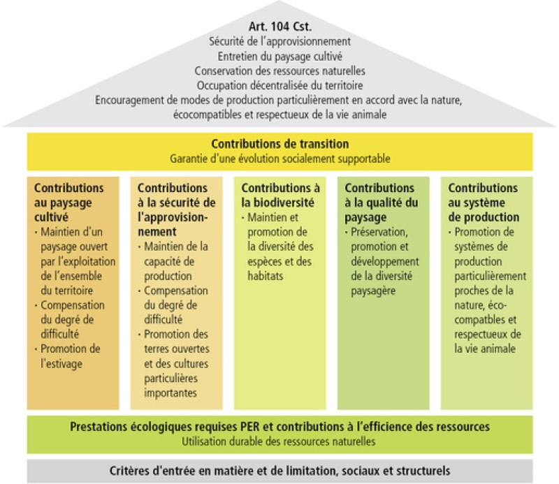 Tous les exploitants dont le domicile de droit civil est en Suisse, qui gèrent une exploitation agricole reconnue, qui n'ont pas plus de 65 ans et qui sont au bénéfice d'une formation agricole, ont la possibilité de demander des paiements directs. La condition de base est l'accomplissement des prestations écologiques requises (PER), dont le respect sera contrôlé par une organisation indépendante. La grandeur minimale que doit atteindre une exploitation qui souhaite solliciter des paiements directs est d'au moins 0,20 UMOS (unité de main-d'oeuvre standard). Les paiements directs sont constitués de différents types de contributions schématisées ci dessous :
