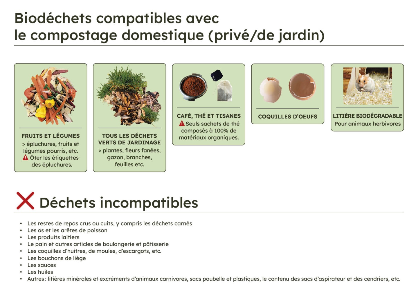 Attention : les déchets tels que les restes d’aliments cuits, les produits carnés et laitiers, les os ou les arêtes de poisson ne sont pas compatibles avec le compostage domestique (attrait d’animaux indésirés tels que rats et renards, mauvaises odeurs, atteintes à l’environnement). Pour les bouchons en liège, il faut privilégier le recyclage séparé via les points de collecte dédiés.