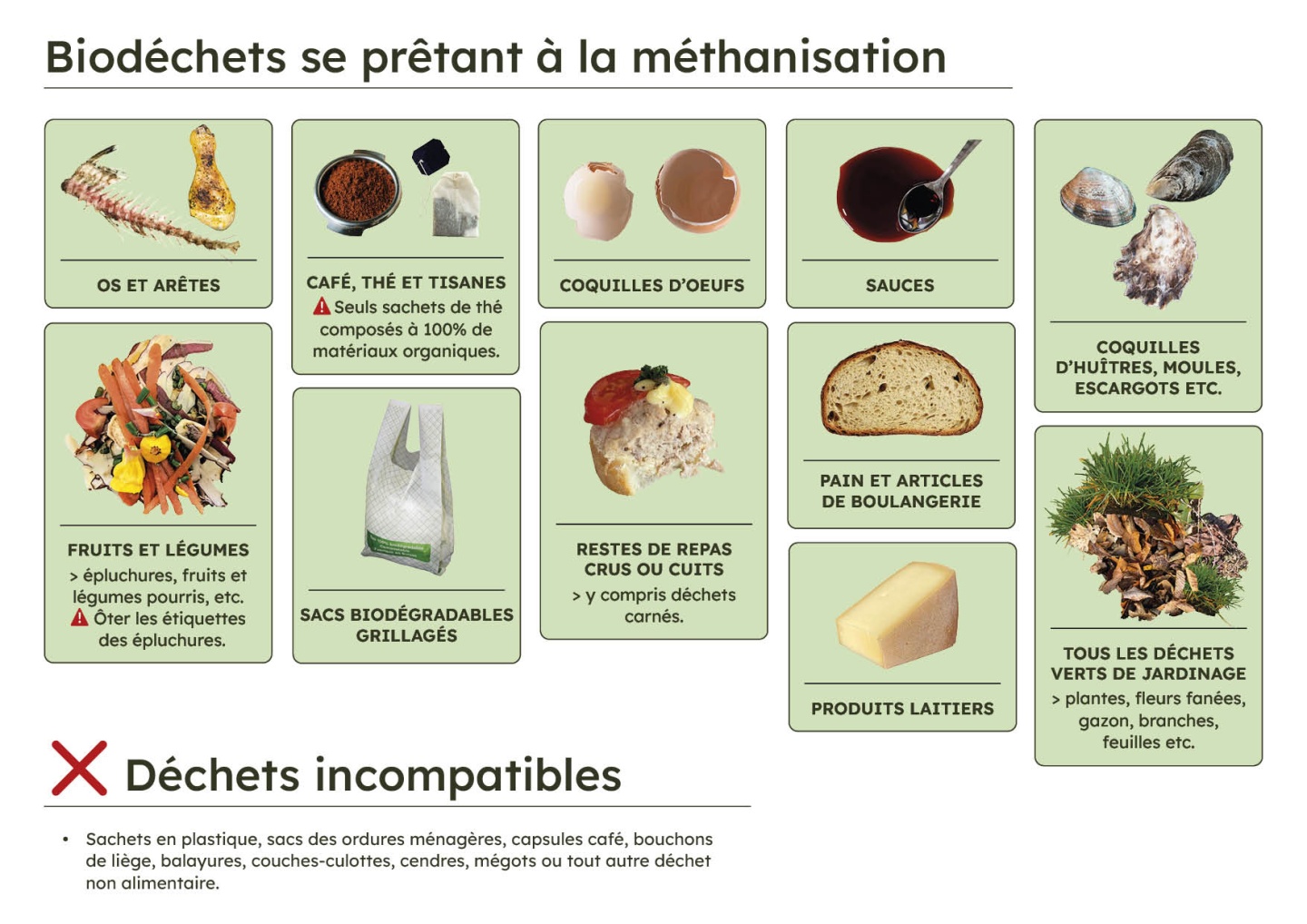 L’Office fédéral de l’environnement a publié une liste des déchets se prêtant au compostage ou à la méthanisation . À partir de cette liste, chaque commune peut adapter la collecte des biodéchets selon la voie de la méthanisation et/ou du compostage.