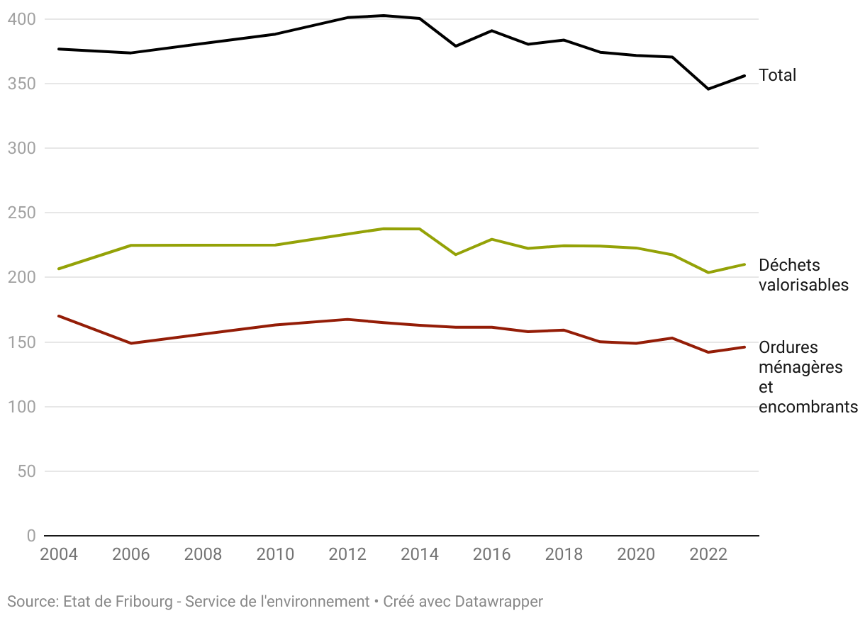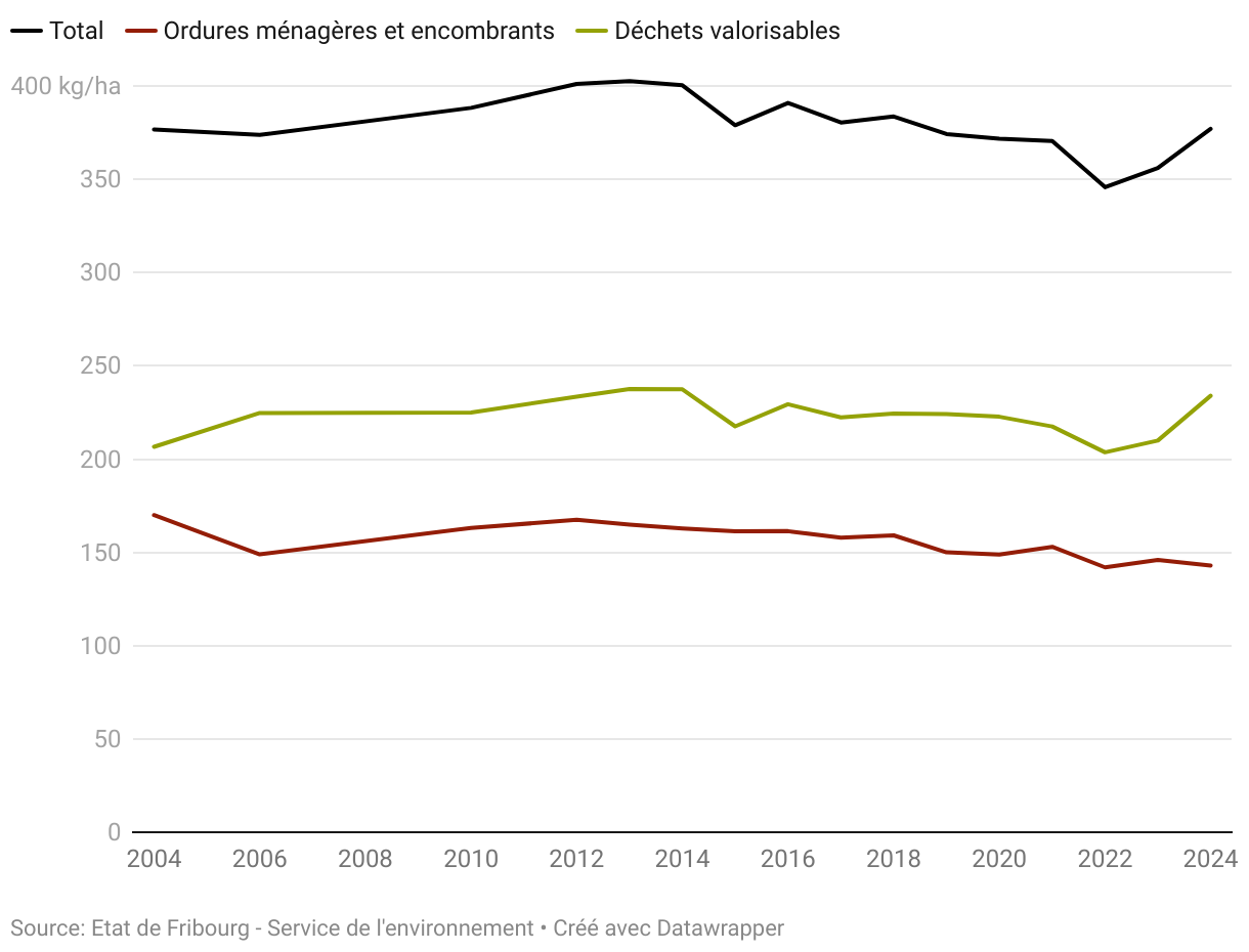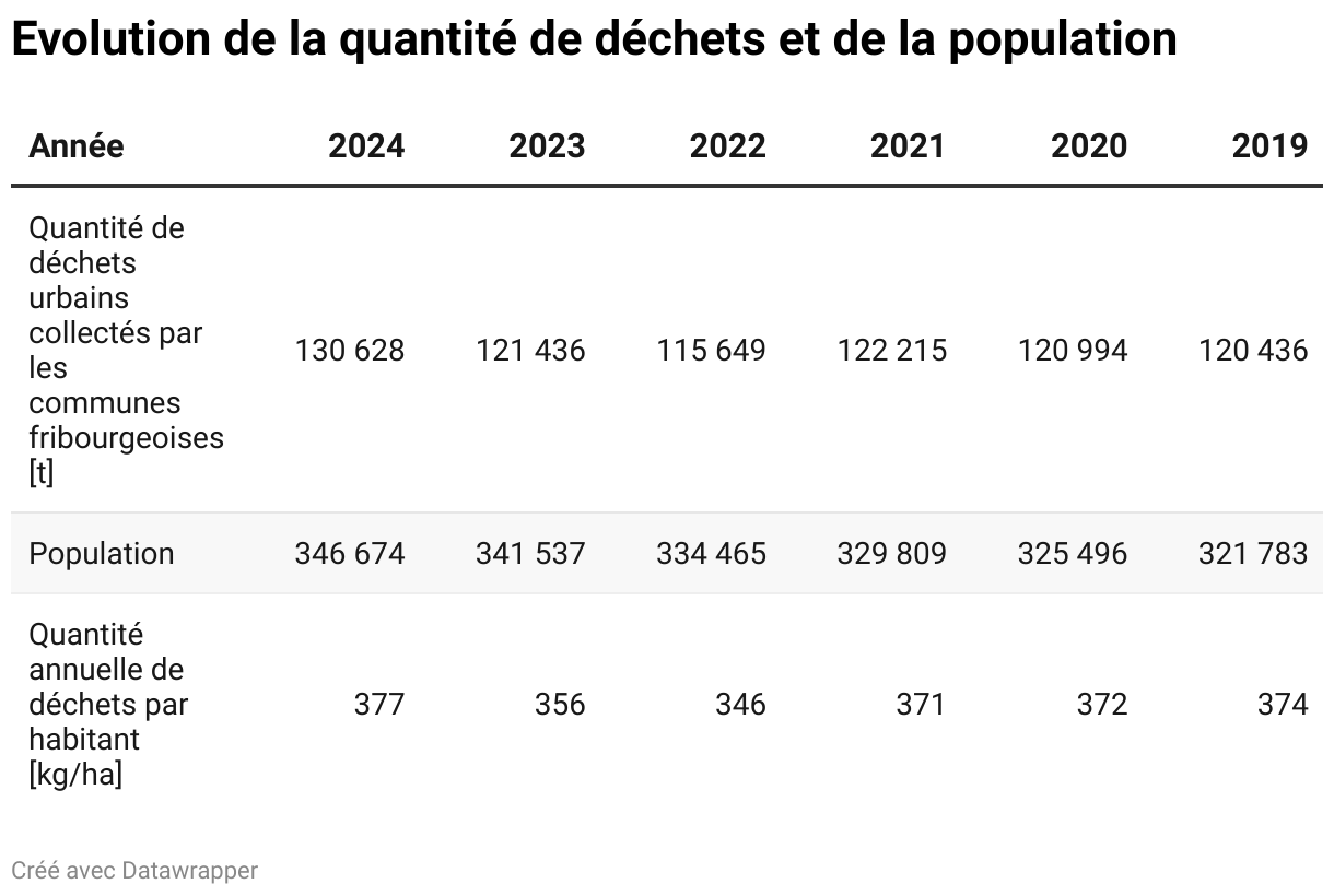 En 2024, chaque habitant du canton de Fribourg a produit en moyenne 377 kg de déchets urbains contre 372 kg en 2002.