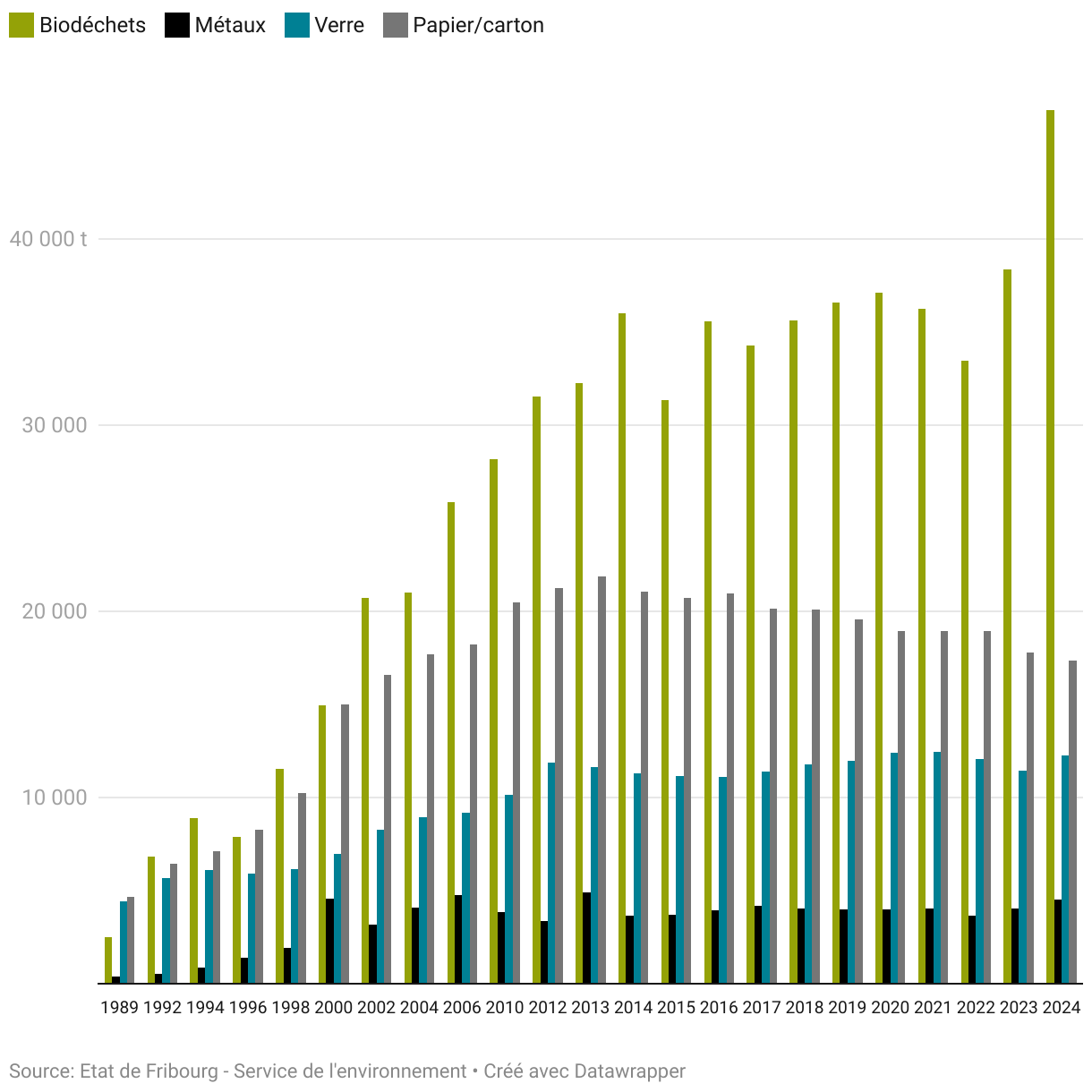 Comme mentionné en préambule, cette statistique ne considère que les principales fractions de déchets valorisables, soit les biodéchets, les métaux, le verre et le papier-carton. Ce choix de publication permet de suivre l’évolution de données dont la récolte est stabilisée depuis de nombreuses années.