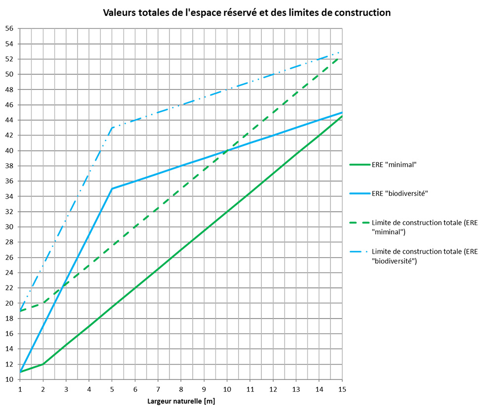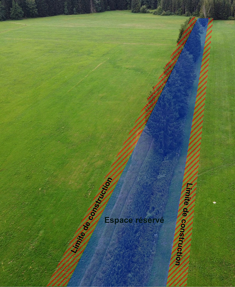 La limite de construction de 4 mètres s’ajoute ensuite à l’ERE délimité. Selon la révision en cours de la LCEaux, la limite de construction devrait être maintenue uniquement où les communes estiment qu’elle est nécessaire pour accéder au cours d’eau et l’entretenir.