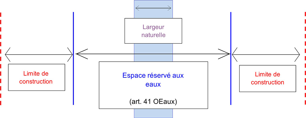 Sur la base de la largeur naturelle, l’ERE est délimité selon les dispositions légales de l’OEaux (art. 41a). Celles-ci sont représentées graphiquement dans la figure ci-dessous.