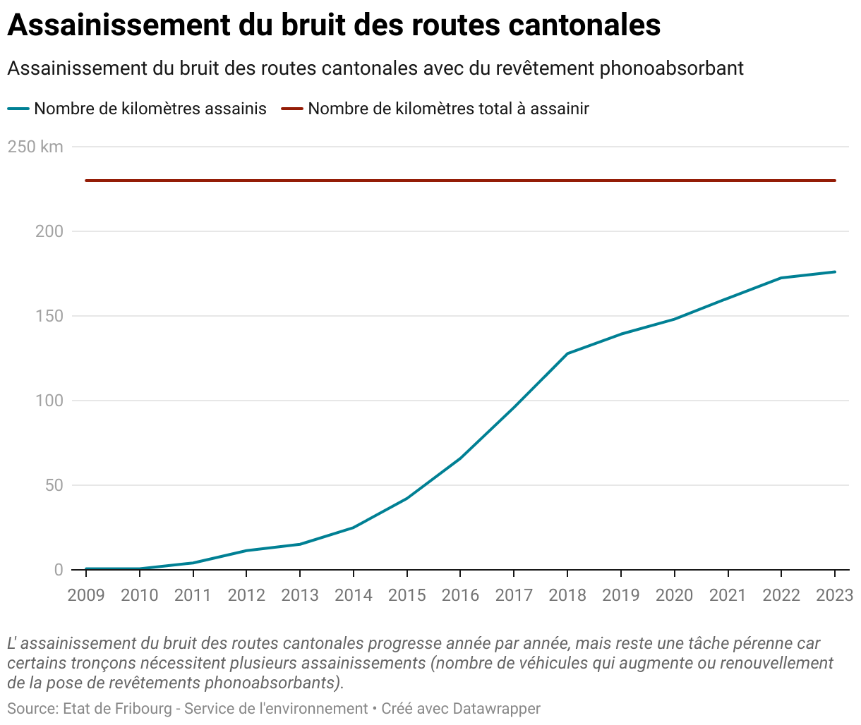 - Le nombre de kilomètres de revêtement phonoabsorbant posés augmente chaque année. Les tronçons restants à assainir présentent une complexité plus élevée que les premiers grands segments déjà traités, ce qui explique des délais d’exécution plus longs.