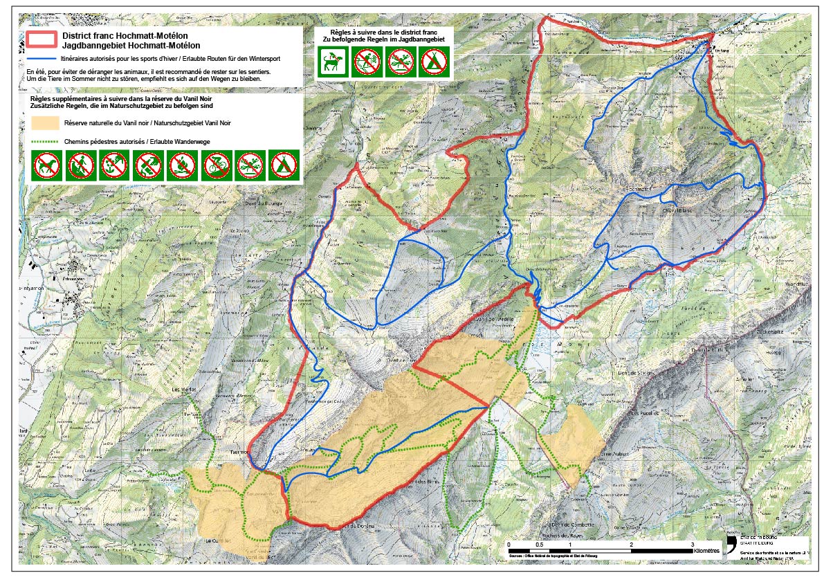 Les districts francs fédéraux du canton de Fribourg sont publiés sur le portail cartographique du canton.