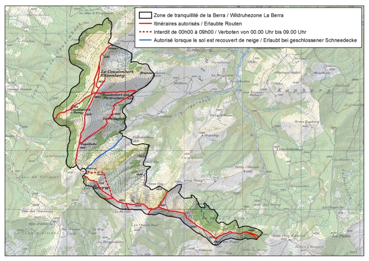 La zone est située de part et d’autre de la crête Cousimbert-Berra-Auta-Chia et s’étire en direction du Plasselbschlund. Elle a pour objectif de canaliser les dérangements durant la période hivernale et au printemps, lorsque la faune sauvage a particulièrement besoin de calme.