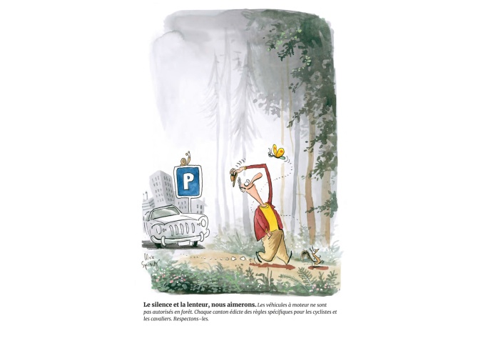 À l’initiative de la Communauté de travail pour la forêt, 20 organisations suisses ont élaboré dix petits principes pour profiter de la forêt tout en la préservant. Le « Petit guide du savoir-vivre en forêt » invite les visiteurs de la forêt à suivre quelques règles simples pour ménager la forêt, ses habitants et ses visiteurs.