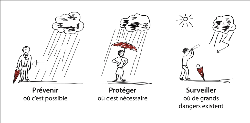 - Prévenir où c'est possible (par ex. cartes des dangers, aménagement du territoire)