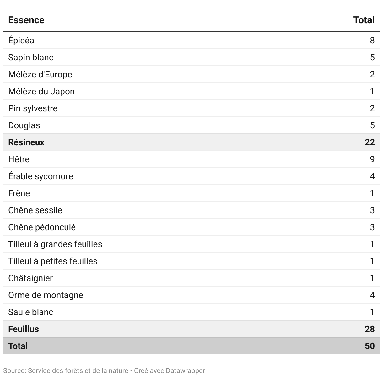 Les 50 peuplements sont les suivants (par essence) :