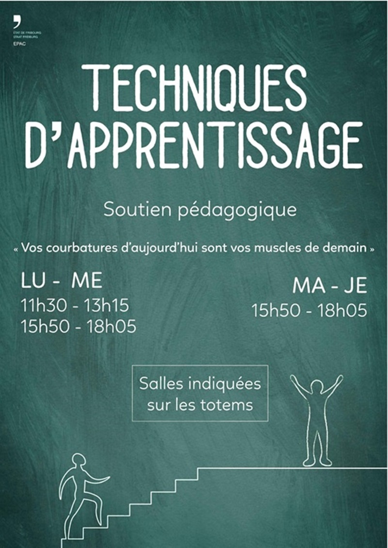 Ces cours s'adressent à tous les apprentis-es intéressés-es à acquérir des techniques d'apprentissage et d'autonomie. Vous y trouverez un soutien individuel et un cadre de travail. Informations détaillées durant les premières semaines de cours par les enseignants Cours dispensés dès la mi-septembre, selon les informations reçues en classe : Horaires dès la Rentrée 2025-2026LUNDI - MARDI - MERCREDI - JEUDI15h50 à 18h05