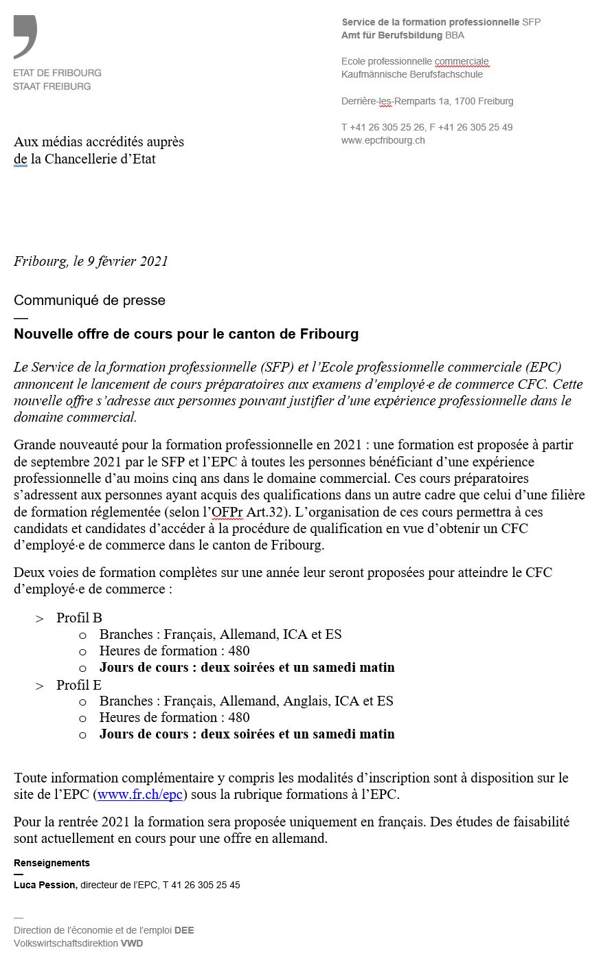 Grande nouveauté pour la formation professionnelle en 2021 : une formation est proposée à partir de septembre 2021 par le SFP et l’EPC à toutes les personnes bénéficiant d’une expérience professionnelle d’au moins cinq ans dans le domaine commercial. Ces cours préparatoires s’adressent aux personnes ayant acquis des qualifications dans un autre cadre que celui d’une filière de formation réglementée (selon l’OFPr Art.32). L’organisation de ces cours permettra à ces candidats et candidates d’accéder à la procédure de qualification en vue d’obtenir un CFC d’employé×e de commerce dans le canton de Fribourg.