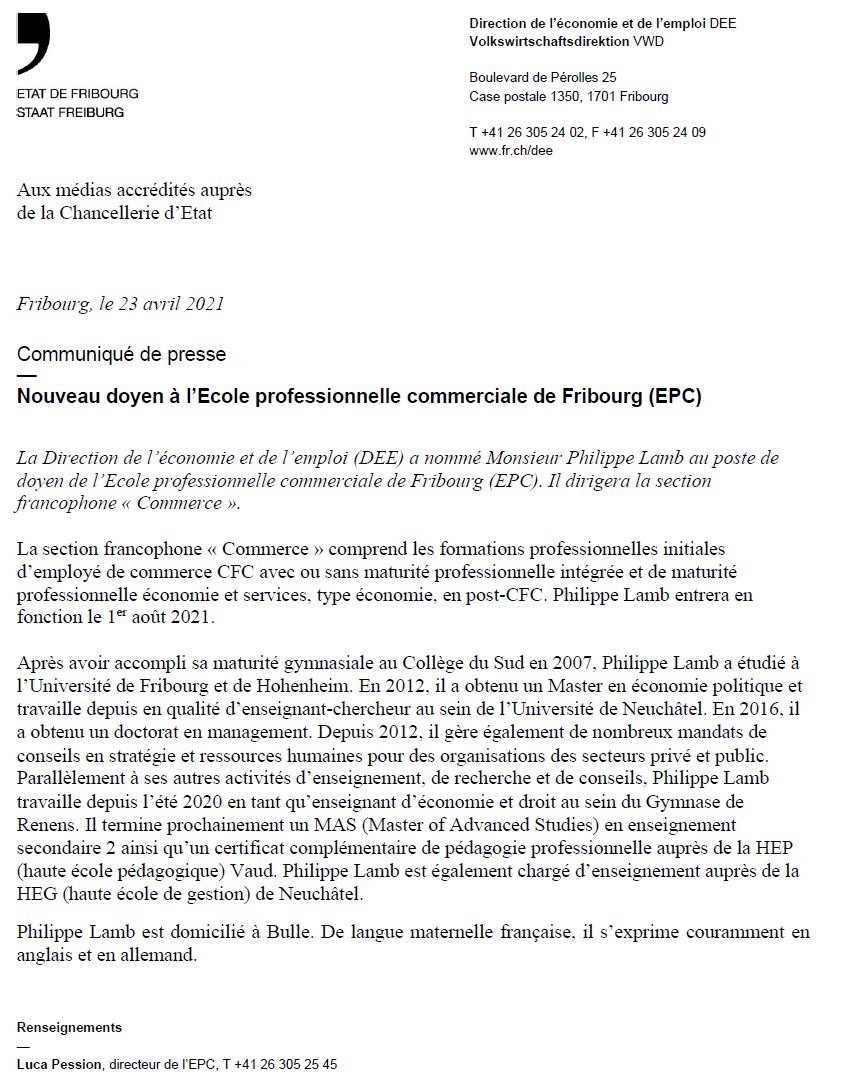 La Direction de l'économie et de l'emploi (DEE) a nommé Monsieur Philippe Lamb au poste de doyen de l'Ecole professionnelle commerciale de Fribourg (EPC). Il dirigera la section francophone "Commerce".