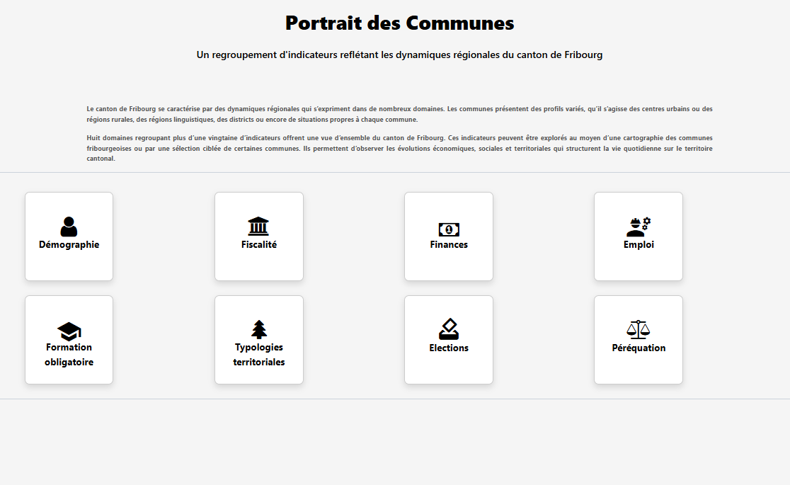 Ce tableau de bord interactif a été développé en étroite collaboration avec le Service de la statistique et de la donnée (SSD) pour offrir une vision précise et complète des communes du canton de Fribourg.
