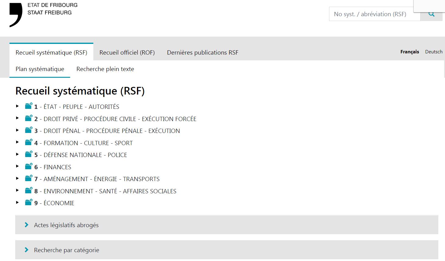 Depuis le 1er janvier 2019, le Recueil officiel fribourgeois (ROF) et le Recueil systématique de la législation fribourgeoise (RSF) sont publiés exclusivement sous forme électronique dans la Banque de données de la législation fribourgeoise (BDLF).