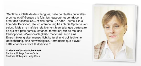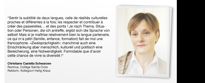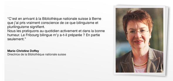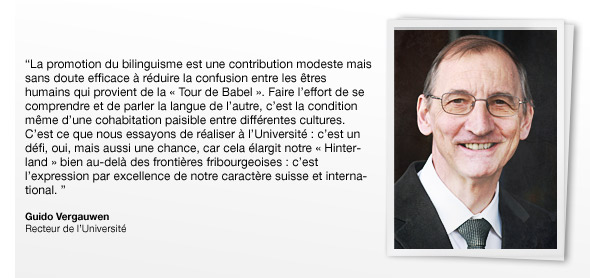 Certes, s’il est possible d’effectuer des études dans une seule langue, une formation bilingue est encouragée. Et pour de nombreux étudiants, cette perspective d’ouverture à d’autres langues et cultures est une des raisons qui les poussent à choisir Fribourg comme lieu d’études. L’Université n’est d’ailleurs pas un établissement destiné à des étudiants déjà bilingues. Des multiples moyens sont proposés aux étudiants qui souhaitent améliorer leurs connaissances linguistiques durant leur parcours universitaire.