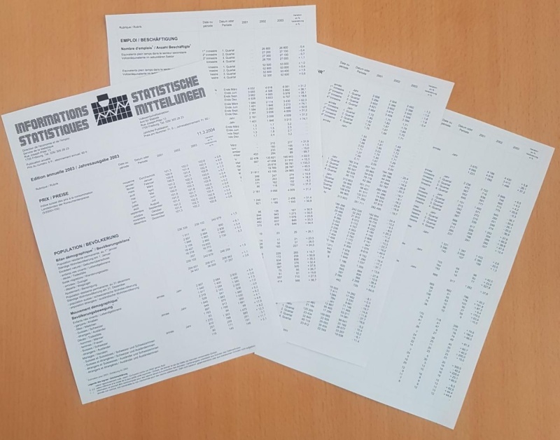 Ce bulletin mensuel a été publié pour la dernière fois à la fin 2003. Il regroupait les principales statistiques disponibles chaque mois (population de la Suisse et du canton, main-d'oeuvre étrangère, emploi, construction, tourisme, faillites, consommation...).