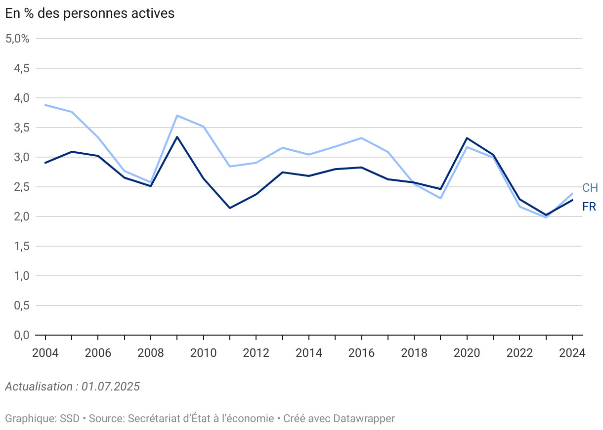 La crise financière mondiale de 2008 a eu un impact significatif sur l'économie mondiale et le canton de Fribourg n’a pas été épargné. Alors que le taux de chômage annuel moyen était de 2,5% en 2008, il est passé à 3,3% l’année suivante. De même, le canton de Fribourg a connu une augmentation significative du taux de chômage en 2020, passant de 2,5% en moyenne annuelle en 2019 à 3,3%. Cela peut être attribué aux effets économiques de la pandémie de COVID-19, qui a entraîné des perturbations majeures dans de nombreux secteurs économiques. En 2021, bien que le taux de chômage annuel moyen soit descendu à 3,0%, il restait au-dessus des niveaux d'avant la pandémie. Les années 2022 et 2023 ont montré une nette amélioration, le taux de chômage atteignant un plancher de 2,0% en moyenne annuelle en 2023. Suite au ralentissement conjoncturel, le taux de chômage est reparti à la hausse en 2024 ; en moyenne annuelle, il se montait à 2,3%, soit 0,3 point de pourcentage de plus que l’année précédente. On constate que le taux de chômage dans le canton de Fribourg se situe généralement en dessous ou, depuis quelques années, très proche de la moyenne nationale. Cela témoigne d'un marché du travail cantonal globalement robuste vis-à-vis des différents chocs conjoncturels qui ont frappé le marché mondial ces dernières années.