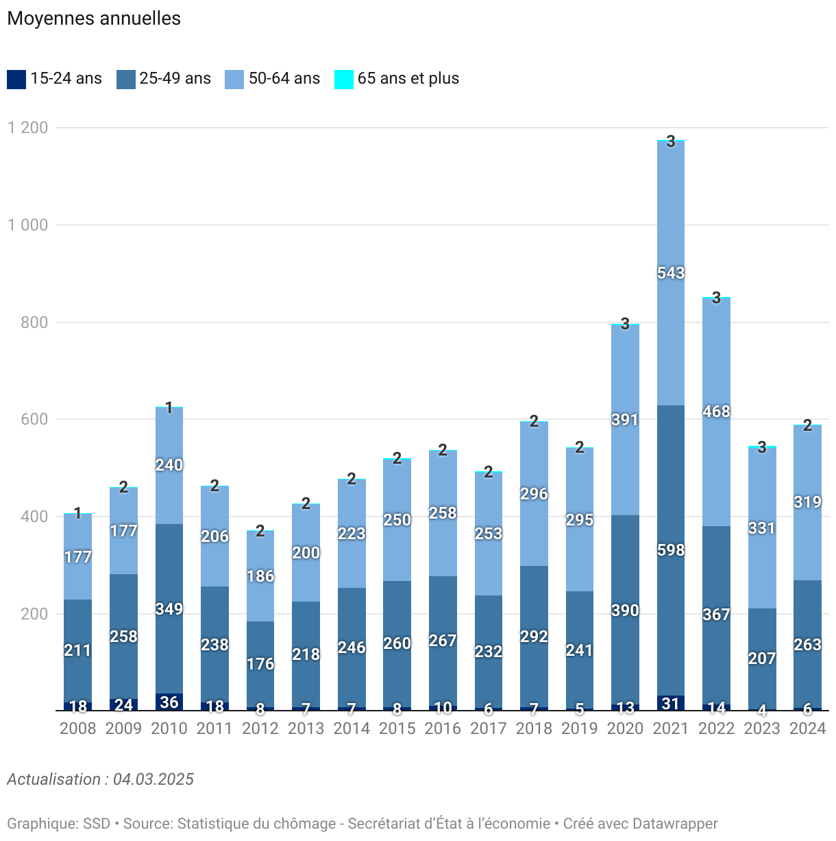 A l’échelle cantonale, la moyenne annuelle totale des chômeurs de longue durée a connu une augmentation progressive au cours de la période considérée, passant de 407 en 2008 à 590 en 2024. Les données disponibles présentent des fluctuations qui suivent de près celle du taux de chômage.
