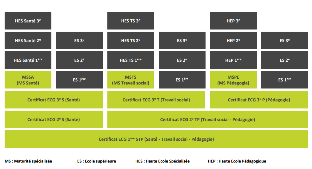 Celle-ci donne accès soit à une haute école spécialisée (HES) des domaines de la santé ou du social, soit à une haute école pédagogique (HEP). La maturité spécialisée est reconnue au niveau national. Les trois domaines de maturité spécialisée sont ceux de la santé, du social et de la pédagogie. La formation dure une année et comporte des aspects théoriques, pratiques et professionnels. Elle se compose finalement d'un travail de maturité spécialisée (TMS).