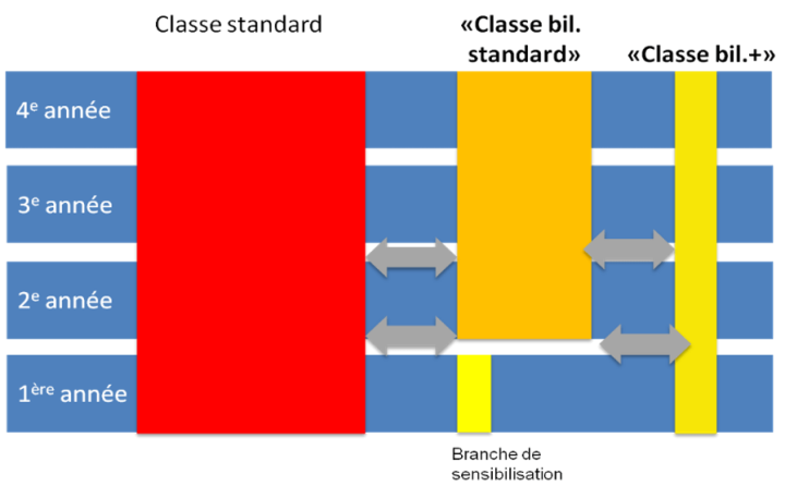 Deux classes, l'une francophone, l'autre germanophone, de même degré et de même domaine sont mises en parallèle dans l'horaire pour les disciplines dites « bilingues ».