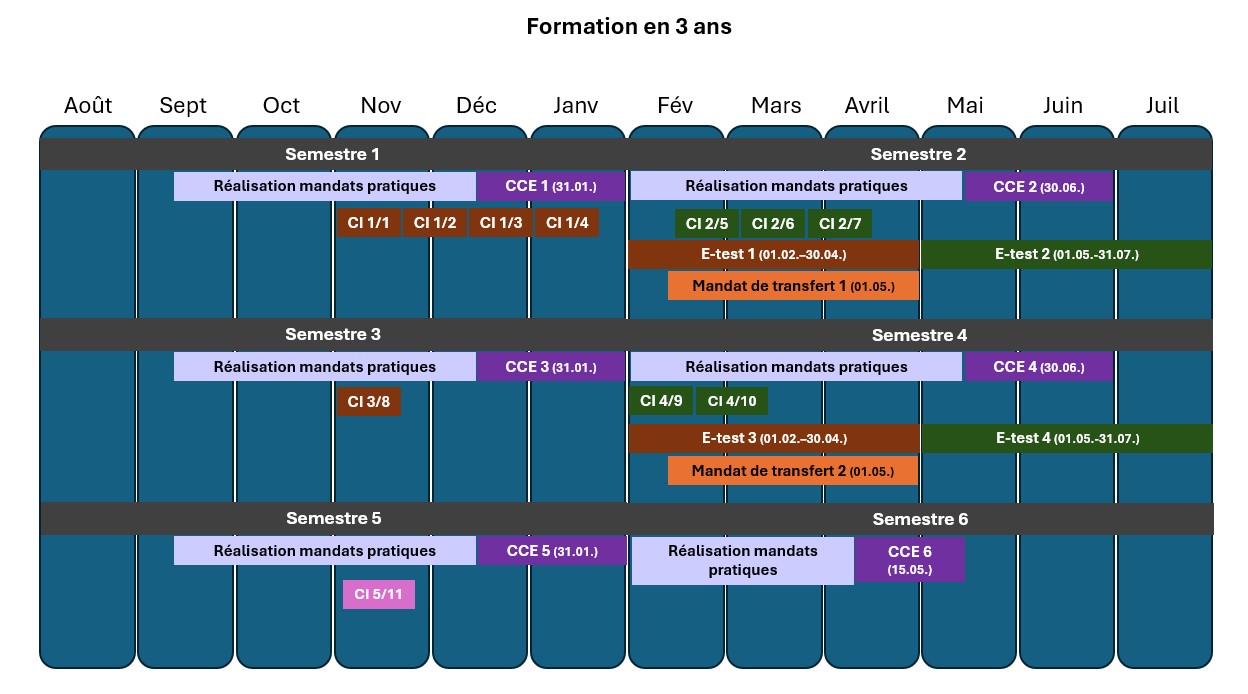- Les objectifs fixés sur la base du programme de formation : développement des compétences opérationnelles sur la base des mandats pratiques et des grilles de compétences.