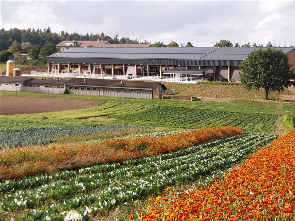 La nouvelle ferme est un modèle de durabilité et de protection du climat. Certains des éléments caractéristiques du bâtiment sont clairement visibles de l’extérieur : la façade en bois fribourgeois et l’installation photovoltaïque sur les deux pans de la toiture. D’autres éléments se trouvent à l’intérieur et ne sont vus que dans un deuxième temps : la charpente, elle aussi en bois fribourgeois, la récupération d’air chaud sous toiture pour le séchage du fourrage, l’utilisation de l’énergie du lisier dans une future installation de biogaz ou encore le raccordement au réseau de chauffage à distance.