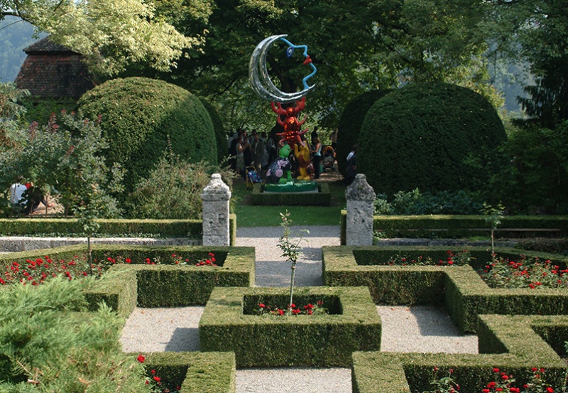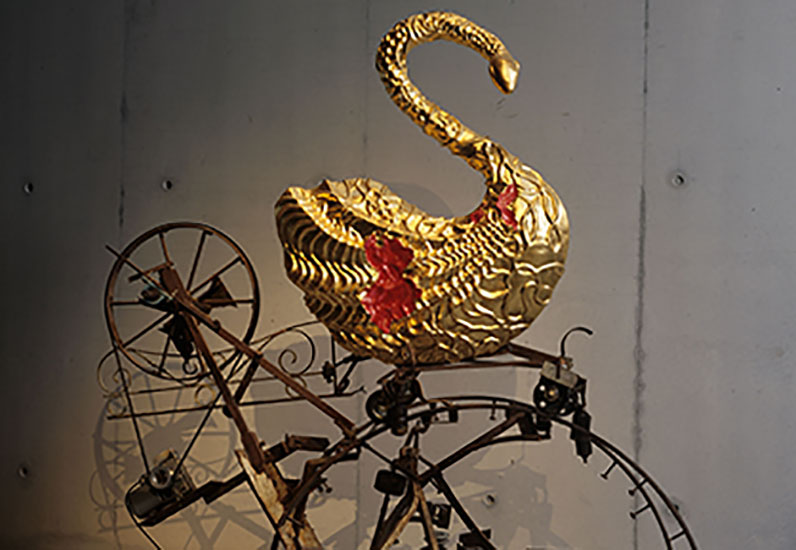 Symbole de l’Espace Jean Tinguely - Niki de Saint-Phalle, l’œuvre évoque un duo d’artistes fascinants. Le socle en fer de Tinguely anime une sculpture dorée de Saint-Phalle. Le thème est la fragilité et l’innocence, incarnées par un animal chimérique : le serpent-cygne.