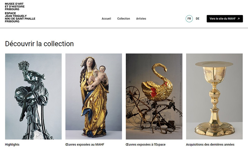 Ayant débuté la mise en ligne de sa collection en 2010, le MAHF a mis à jour sa collection en ligne cet été, et bénéficie désormais d’un site compatible avec les smartphones et tablettes. La mise en page fait la part belle aux photographies des objets de la collection, et permet de visualiser les œuvres exposées au MAHF et à l’Espace Jean Tinguely-Niki de Saint Phalle. La page d’accueil vous fait également découvrir les acquisitions et dons de ces dernières années.