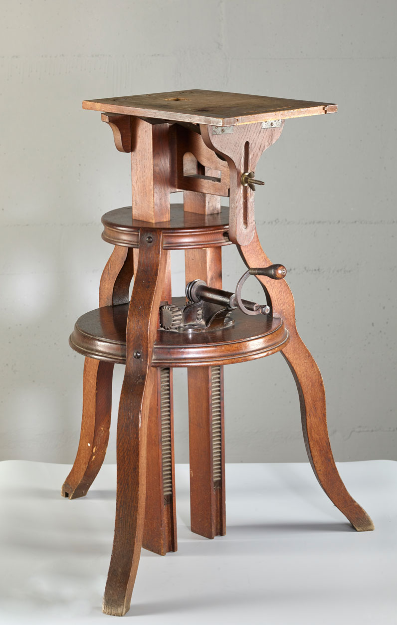 L’outillage des photographes Macherel - Suite à l’exposition « Fribourg Belle Epoque. Photographies de l’atelier Macherel » durant l’été 2017, le MAHF a pu acquérir auprès des descendants des photographes une série impressionnante d’appareils, d’objectifs et d’autres éléments composant l’outillage de l’atelier à la fin du XIXe et au début du XXe siècle. Deux chambres sont issues de la maison Engel-Feitknecht, un des rares fabricants suisses de caméras – Alfred Engel-Feitknecht avait commencé sa production en 1878 à Douanne ; en 1902 l’entreprise fut transférée à Bienne pour devenir, en 1915, Perrot & Cie. En particulier, la somptueuse chambre de studio démontre le soin minutieux apporté au travail non seulement des parties en laiton et verre des objectifs, mais aussi de l’ébénisterie qui entrait alors pour une part importante dans la fabrication des appareils photographiques. Les trois générations de photographes Macherel en étaient conscientes : les anciennes caméras nous sont parvenues en très bon état, même le trépied de studio en bois massif, une pièce rare !